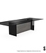 Dining table with extralight clear or smoked laminated glass top. Base composed of a wooden element, various finishes, and a black lacquered laminated glass element.